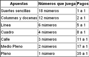 Hay dos tipos de Ruleta: la Ruleta Americana y la Ruleta Francesa. La diferencia entre estos dos tipos es el número cero en la rueda. La Ruleta Americana tiene dos ceros en su rueda, el “0” y el “00” lo cual aumenta la ventaja de la casa a 5,4%. En la Ruleta Francesa hay tan sólo un cero, por lo que la ventaja de la casa es de 2,7%. El jugador tiene una oportunidad en 37 de ganar, pero igualmente se le continúa pagando 35 a 1, igual que en la ruleta americana.